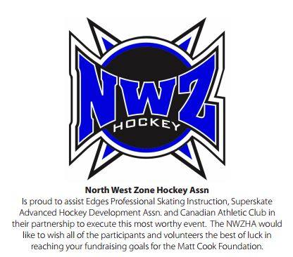 North West Zone Hockey Association is proud to assist Edges Professional Skating Instruction, Superskate Advance Hockey Development Association and the Canadian Athletic Club in their partnership to execute this most worthy event. The NWZHA would like to wish all of the participants and volunteers the best of luck in reaching your fundraising goals for the Matt Cook Foundation.